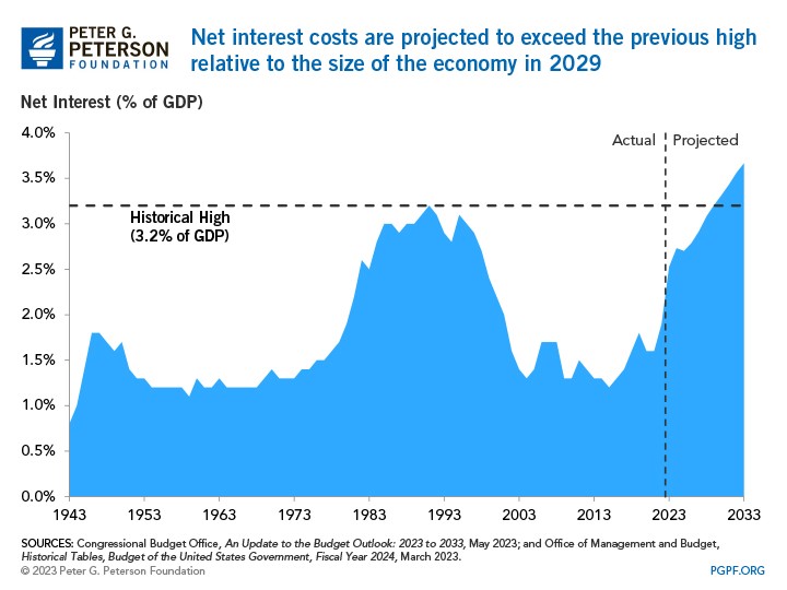 The level and trajectory of federal debt is a central reason for Fitch’s downgrade. At nearly 100 percent of gross domestic product (GDP), the U.S. debt-to-GDP ratio is significantly higher than that of most other AAA-rated countries. According to projections from the Congressional Budget Office, the nation’s debt will soon exceed its all-time high relative to GDP and skyrocket to 181 percent in 2053.